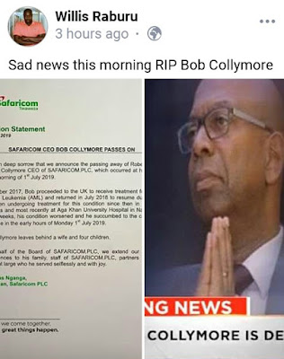 Kenya has woken up to a sad news following the passing of Safaricom C.E.O Bob Collymore was has been Ill for some time.His death has shocked many owing to the fact that he not only stood at the top of an international telco but also his support toward community initiatives across the country including working with different Kenyan celebrities to make life better for the less previlleged. Above all Bob Collymore played an important role in the entertainment sector from sports to music to film and even comedy.To date Safaricom is still a leading sponsor in the country.